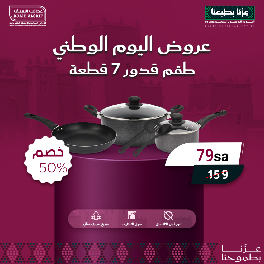 - طقم أواني طهي غير لاصقة مكون من 7 قطع مع كـسرولات ومقالي تتميز بهيكل قوي من الألومـنيوم المقاوم للحرارة وطلاء غير لاصق من 3 طبقات.